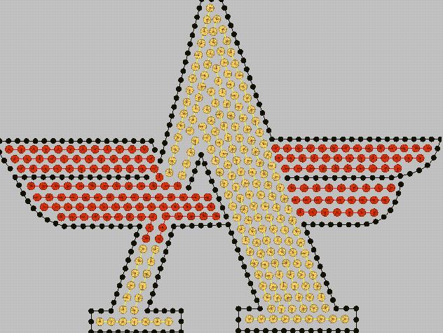Yeh A hotfix sequins design ek winged “A” alphabet structure par adharit hai. Isme kul 665 stitches ka upyog kiya gaya hai jo 585 sequins ko fabric par fix karne ka karya karte hain. Design mein teen rangon (Black, Red, Gold) ka upyog kiya gaya hai jo ek vyavasthit visual contrast pradan karte hain. Gold sequins (186 count) madhya bhag mein “A” aakar banate hain, jabki Red (160 count) aur Black (239 count) sequins wing structure aur outlines ko vyavasthit karte hain.