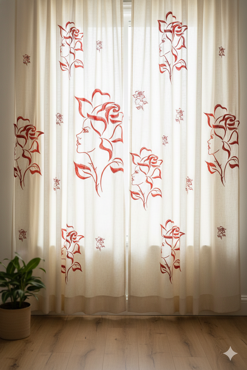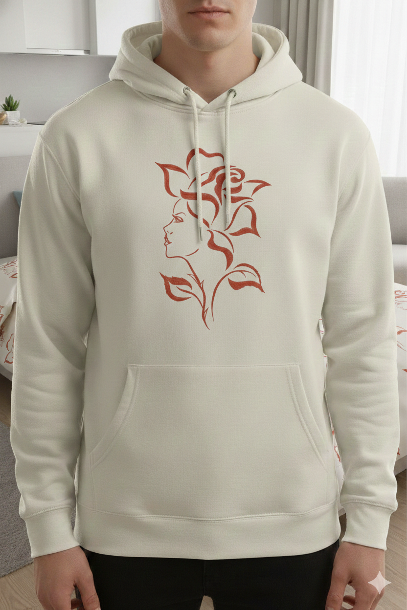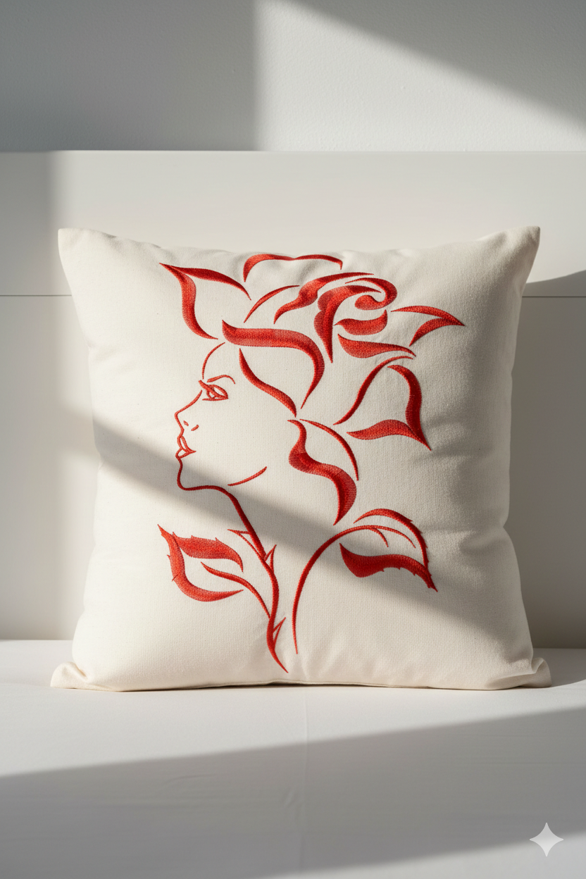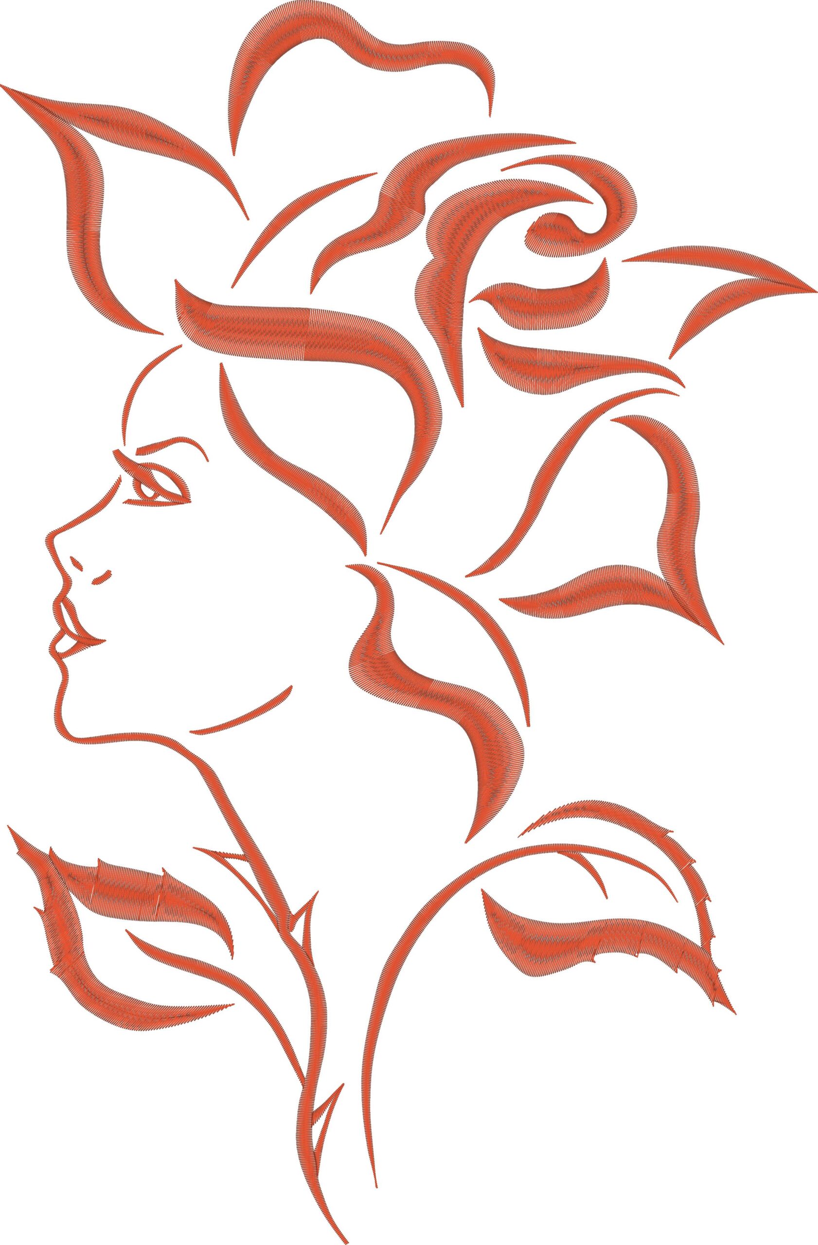 Is design mein ek ladki ke chehre ki outline ko khubsoorat rose petals aur vines ke saath merge kiya gaya hai. Yeh “line art” style embroidery aaj kal fashion aur home decor mein kaafi trending hai. Iski simplicity hi iski sabse badi khoobsurti hai, jo ise har tarah ke fabric par premium look deti hai.